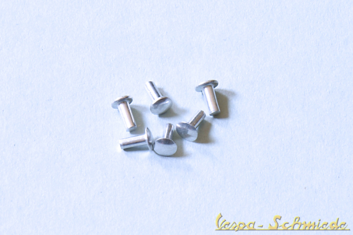 6 Niete (M2x5) zur Befestigung des Schriftzuges am Beinschild passend für folgende Vespa-Modelle: 125 / TS / 150 / GL / GS / Lampe unten / ... Die passenden Schriftzüge finden Sie ebenfalls bei uns im Shop!
